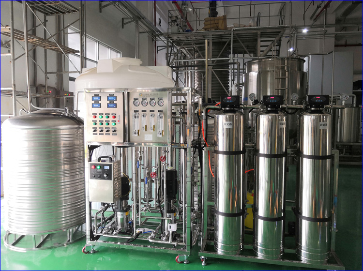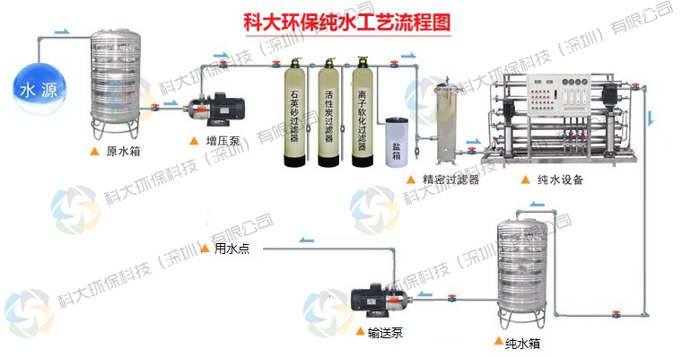 源水箱→源水增壓泵→多介質過濾器→活性碳過濾器→陽樹脂軟化器→精密過濾器→一級RO反滲透純水系統→二級RO反滲透純水系統→水氣混合器→臭氧殺菌機→不銹鋼純水罐→恒壓輸送系統用水點