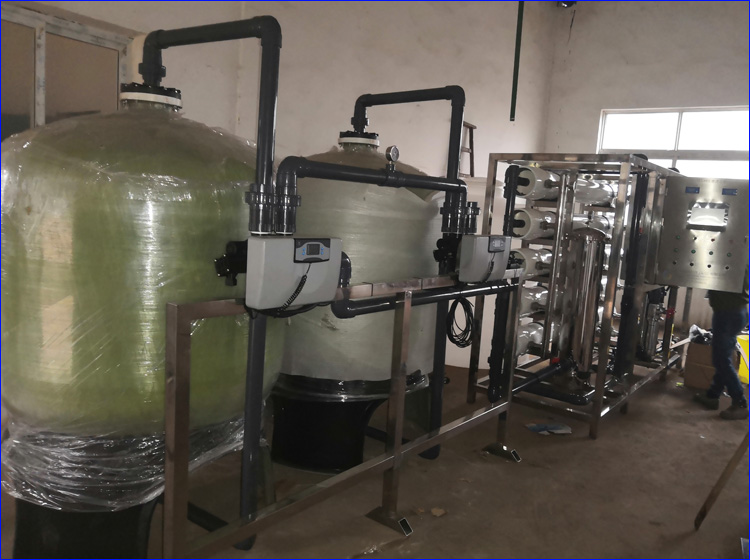 自來水---->原水箱---->供水泵---->多介質過濾器---->活性炭過濾器---->軟化過濾器---->保安過濾器---->高壓泵---->反滲透機組---->純水箱---->恒壓輸送系統---->用水點